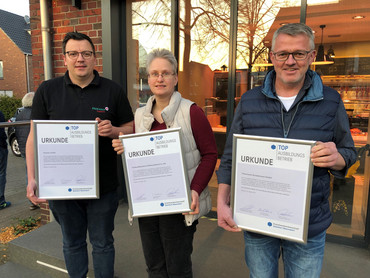 Bernd Hokamp, Andrea Runge und Obermeister Jörg Sundermann für erfolgreiches Ausbilden die Urkunde "TOP-Ausbildungsbetrieb" durch den Bereichsleiter Innungen, Herrn…