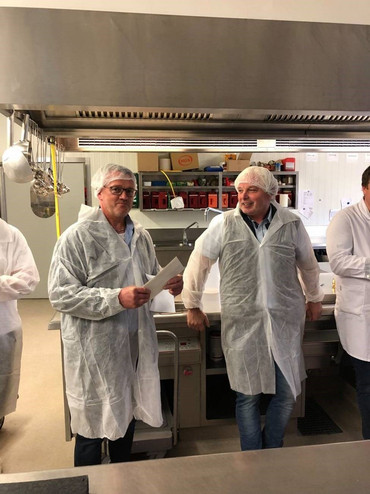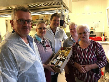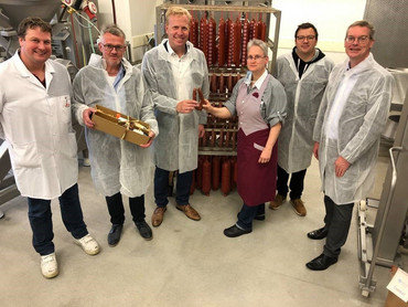 Für die Durchführung der letzten Innungsversammlung und Vorstellung der Feinkostfleischerei mit Schlachtung und der Produktion der Fleisch- und Wurstwaren bedankte sich Obermeister Jörg Sundermann u. a. mit einem Präsent bei Familie Hidding.